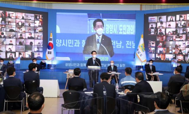 Äڷγª19·Î ÃÖ¼ÒÇÑÀÇ Àοø¸¸ Çà»çÀå¿¡ Âü¼®Çϰí, ÁֹΠ180¸íÀÌ ºñ´ë¸é ¿µ»óÀ» ÅëÇØ Âü¿©ÇÑ À̳¯ ±¤¾ç½Ã µµ¹Î°úÀÇ ´ëÈ­´Â ±è±âÈ« Àü³²µµ Á¤Ã¥±âȹ°üÀÇ µµÁ¤º¸°í, ±è°æÈ£ ±¤¾ç½Ã ºÎ½ÃÀåÀÇ ±¤¾ç½Ã Çö¾Èº¸°í, ±è Áö»ç¿Í ÇöÀ塤¿µ»ó Âü¿©ÀÚ °£ ´ëÈ­ ¼øÀ¸·Î ÁøÇàµÆ´Ù.