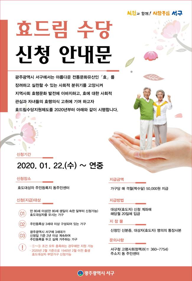 À̹ø Áö¿ø»ç¾÷À» À§ÇØ ¼­±¸´Â Áö³­ÇØ 12¿ù¡¸±¤ÁÖ±¤¿ª½Ã ¼­±¸ È¿ÇàÀå·Á ¹× Áö¿ø¿¡ °üÇÑ Á¶·Ê¡¹¸¦ °³Á¤¡¤°øÆ÷Çß´Ù. ½Åû´ë»óÀº ¸¸ 80¼¼ ÀÌ»óÀÎ È¿µµ´ë»óÀÚ¸¦ ¸ð½Ã´Â 3¼¼´ë ÀÌ»ó ±¸¼º °¡±¸·Î ¼­±¸¿¡¼­ 2³â ÀÌ»ó Áֹεî·ÏÀ» µÎ°í ½ÇÁ¦°ÅÁÖ Çϰí ÀÖ¾î¾ß ÇÑ´Ù. ½ÅûÀº ÁÖ¼ÒÁö µ¿ ÇàÁ¤º¹Áö¼¾ÅÍ¿¡¼­ Áö±Þ½Åû¼­¸¦ ÀÛ¼º, °ü·ÃÀڷḦ ÷ºÎÇØ Á¦ÃâÇÏ¸é µÇ¸ç ÃÖ´ë ¿¬ 30¸¸¿øÀÇ Çö±ÝÀ» Áö±ÞÇÒ ¿¹Á¤ÀÌ´Ù.