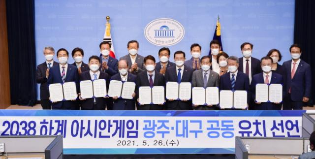 À̿뼷 ±¤ÁÖ±¤¿ª½ÃÀå°ú ±Ç¿µÁø ´ë±¸±¤¿ª½ÃÀåÀº 26ÀÏ ¿ÀÈÄ ±¹È¸ ¼ÒÅë°ü¿¡¼ ¡°¾ç ½Ã¹ÎµéÀÇ ¿°¿øÀ» ¸ð¾Æ ¡®2038 ÇÏ°è ¾Æ½Ã¾È°ÔÀÓ °øµ¿À¯Ä¡¡¯¸¦ À§ÇØ ÇÔ²² ³ë·ÂÇϰڴ١±°í ¹àÇû´Ù.