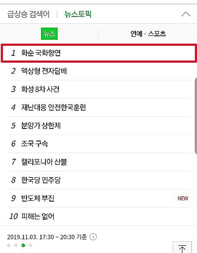 È­¼ø±º(±º¼ö ±¸Ãæ°ï)¿¡ µû¸£¸é, È­¼ø ±¹È­Ç⿬ÀÌ Æ÷ÅлçÀÌÆ® ½Ç½Ã°£ °Ë»ö¾î 1À§¿¡ ¿À¸¥ °ÍÀº Áö³­ 3Àϰú 4ÀÏÀÌ´Ù. ³×À̹ö¿¡¼­´Â ÁÖ¸»ÀÎ 3ÀÏ ´º½º ½Ç½Ã°£ °Ë»ö¾î 1À§¿¡ ¿Ã¶ú°í, 4ÀÏ¿¡´Â ¡®Áö¿ª¡¤¸í¼Ò Àϰ£ °Ë»ö¾î¡¯ »óÀ§±Ç¿¡ ÁøÀÔÇß´Ù. ´ÙÀ½¿¡¼­´Â 4ÀÏ ¡®Àϰ£ Áö¿ª ÃàÁ¦ °Ë»ö¾î¡¯ 1À§¸¦ Â÷ÁöÇß´Ù.