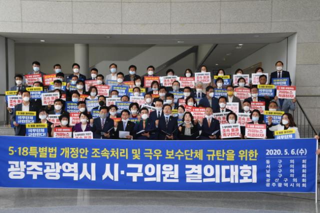 ±¤ÁÖ½ÃÀÇȸ¿Í 5°³ ÀÚÄ¡±¸ ¼Ò¼ÓÀÇ¿ø 90¿©¸íÀº 6ÀÏ ¿ÀÀü ±¤ÁÖ½Ãû 1Ãþ ½Ã¹ÎȦ¿¡¼­ ½Ã‧ÀÚÄ¡±¸ÀÇȸ ÇÕµ¿ °áÀÇ´ëȸ¸¦ °³ÃÖÇÏ¿© ±Ø¿ìº¸¼ö´ÜüÀÇ ±Ý³²·Î Áýȸ ÃßÁøÀ» ±ÔźÇϰí 5‧18À» ¿Ö°î‧³¯Á¶ÇÏ´Â ÇàÀ§¸¦ ±ÝÁöÇÏ´Â 5‧18Ưº°¹ýÀÇ Á¶¼ÓÇÑ Ã³¸®¸¦ Ã˱¸ÇÏ´Â ¼º¸íÀ» ¹ßÇ¥Çß´Ù.