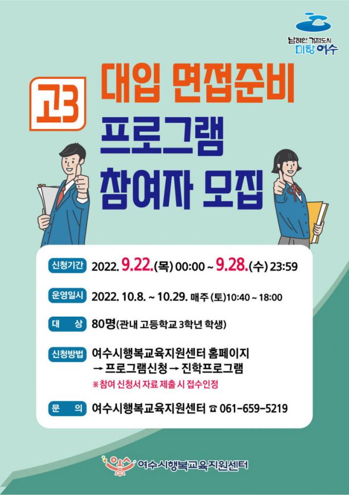 ¿©¼ö½Ã(½ÃÀå Á¤±â¸í)°¡ °íµîÇб³ 3Çг⠼öÇè»ýÀ» ´ë»óÀ¸·Î ¡®´ëÀÔ ¼ö½ÃÀüÇü ¸éÁ¢Áغñ Áö¿ø ÇÁ·Î±×·¥¡¯À» ¿î¿µÇÑ´Ù.