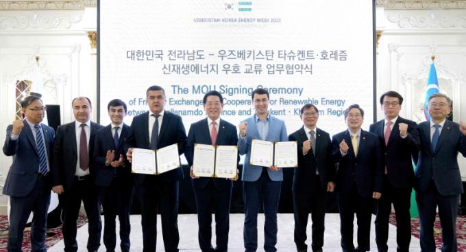 ±è¿µ·Ï Àü¶ó³²µµÁö»ç°¡ 5ÀÏ(ÇöÁö½Ã°£) ¿ìÁŰ½ºÅº Ÿ½´ÄËÆ® ½ÃƼÆÈ·¹½º È£ÅÚ¿¡¼ ¡®Àü³²µµ-¿ìÁŰ½ºÅº Ÿ½´ÄËÆ®¡¤È£·¹Áò ½ÅÀç»ý¿¡³ÊÁö ¿ìÈ£ ±³·ù ¾÷¹«Çù¾à¡¯À» ü°áÇÏ°í ±â³äÃÔ¿µÀ» Çϰí ÀÖ´Ù.(¿ÞÂʺÎÅÍ ¹«¸£µå ¾ÆÈú·ÎÇÁ È£·¹Áò ºÎÁÖÁö»ç, ±è¿µ·Ï Àü¶ó³²µµÁö»ç, ³ªÁµò »þ¸®Æ÷ÇÁ Ÿ½´ÄËÆ® ºÎÁÖÁö»ç.)