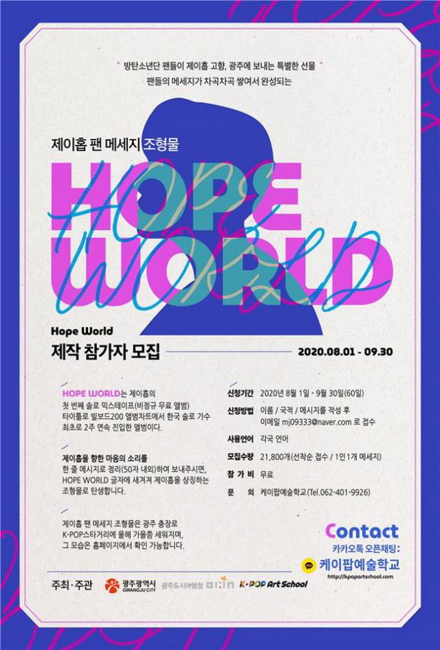±¤Áֽô ¼¼°è ¹æÅº¼Ò³â´Ü ÆÒµé°ú ÇÔ²² ±¤ÁÖ ÃæÀå·Î K-POP½ºÅ¸°Å¸®¿¡ ¡®HOPE WORLD¡¯ Á¦ÀÌÈ© ÆÒ ¸Þ½ÃÁö Á¶Çü¹°À» Á¶¼ºÅ°·Î Çϰí, 9¿ù30ÀϱîÁö 2¸¸1800°³ÀÇ ¸Þ½ÃÁö¸¦ ¸ðÀº´Ù´Â °èȹÀÌ´Ù.