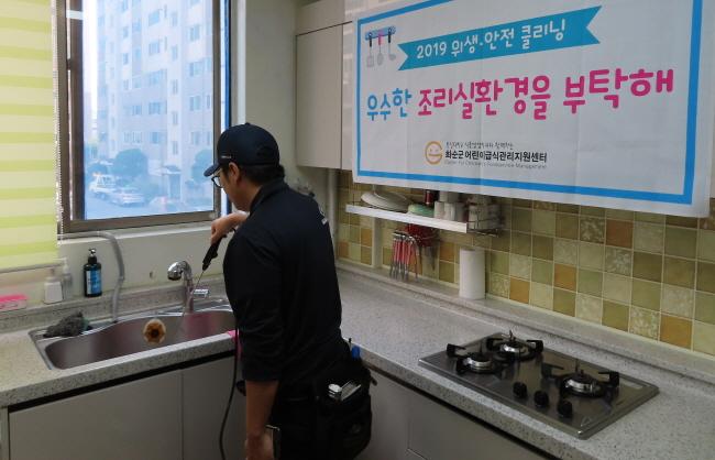¼¾ÅÍ´Â ¡®¿ì¼öÇÑ Á¶¸®½Ç ȯ°æÀ» ºÎÅ¹ÇØ¡¯¶ó´Â »ç¾÷¸íÀ¸·Î °¨¿°º´ ¿¹¹æ ¼Òµ¶°ü¸® Àǹ«°¡ ¾ø´Â ¼Ò±Ô¸ð ±Þ½Ä¼Ò¸¦ ´ë»óÀ¸·Î ¼Òµ¶ Àü¹® ¾÷üÀÇ ÀηÂÀ» Áö¿øÇØ Ã»°áÇÑ Á¶¸®½Ç ȯ°æÀ» Á¦°øÇϱâ À§ÇØ Áö¿ø »ç¾÷À» ÃßÁøÇß´Ù. Áö¿ø »ç¾÷Àº 2°³¿ù¿¡ ÇÑ ¹ø¾¿ 3Â÷·Ê¿¡ °ÉÃÄ ÁøÇàÇß´Ù.