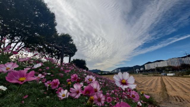 ÇÑ⠲ɸ¶¿ïÀ» ÅͶ߸° ÄÚ½º¸ð½º´Â û¸íÇÑ °¡À» Çϴðú ¾î¿ì·¯Á® °¡À»À» ¸¸³£ÇÒ ¼ö Àִ dz°æÀ» ¸¸µé¾î ³»°í ÀÖ´Ù. ÄÚ½º¸ð½º´Â ³ªºñ¹Ù´Ã²É(°¡¿ì¶ó)Àº »êÃ¥¿¡ ³ª¼± ÁֹεéÀ» ¹àÀº ¹Ì¼Ò·Î ¹Ý±â°í ÀÖ´Ù.