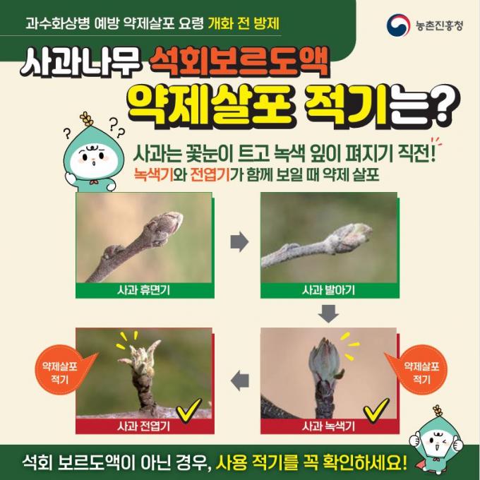 °³È­ Àü ¹æÁ¦´Â ¹èÀÇ °æ¿ì ²É´«ÀÌ Æ° Á÷ÈÄ, »ç°úÀÇ °æ¿ì ²É´«ÀÌ Æ®°í ³ì»ö ÀÙÀÌ ÆìÁö±â Á÷Àü¿¡ ½Ç½ÃÇØ¾ß ÇÑ´Ù. ¶ÇÇÑ °ú¼öÀÇ »ýÀ° ´Ü°è¸¦ È®ÀÎÇÑ µÚ Àû±â¿¡ 1Â÷ ¾àÁ¦¸¦ »ìÆ÷ÇØ¾ß Çϸç, ¼®È¸À¯È²ÇÕÁ¦¿Í ÇÔ²² »ìÆ÷ÇÒ °æ¿ì ¾àÇØ°¡ ¹ß»ýÇÒ ¼ö ÀÖ¾î ¼®È¸À¯È²ÇÕÁ¦ »ìÆ÷ ÈÄ ÃÖ¼Ò 7ÀÏ ÀÌ»óÀÇ °£°ÝÀ» µÎ¾î¾ß ÇÑ´Ù.